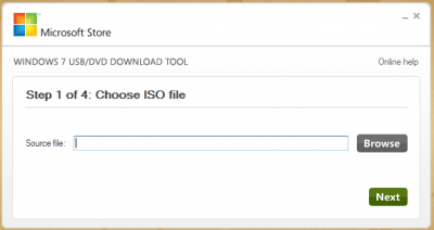 3. Start Windows 7 USB/DVD download tool. In the SOURCE FILE box, type the name and path of your Windows 7 ISO file, or click BROWSE and select the file from the OPEN dialog box. Click NEXT.